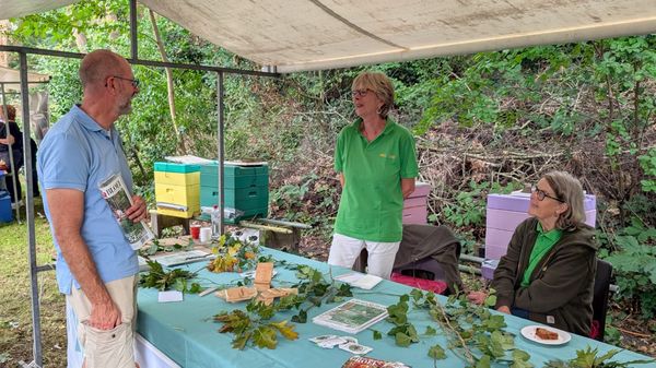 Toch waren er ook in de middag nog bezoekers die langs de kraampjes struinden: het soort publiek dat niet bang is voor modderige schoenen! Deze markt voorziet echt in een behoefte: er waren heel veel gezinnen met jonge kinderen met interesse voor de natuur. Er was dan ook weer van alles te doen. Ook in de aangrenzende Kindertuinen was het ontzettend druk: pompoenen, boeketjes, plantjes: er stonden rijen bij de kassa. Wij hadden boeiende gesprekken bij onze met natuurlijke materialen ingerichte kraam: de takken en bladeren lagen achter ons voor het oprapen! De gratis edities van Groei & Bloei uit 2024, de notitieblokjes en pennen gingen grif van de hand. Weliswaar heeft het ons ter plekke geen nieuwe leden opgeleverd, maar we hebben wel veel mensen enthousiast gemaakt voor de vereniging en voor onze afdeling. Ook hebben we leuke contacten gelegd met leden van de Imkervereniging, waaruit we zeker nog een follow up verwachten voor het Open Tuinenweekend en een Avondexcursie