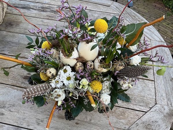 Het was een gezellige middag in het atelier van de Blommenhoeve in Eemnes. Zeven enthousiaste dames gingen onder de inspirerende begeleiding van Evelien aan de slag met verse bloemen, bolletjes, takken, veertjes en echte eieren in vrolijke lentekleuren.